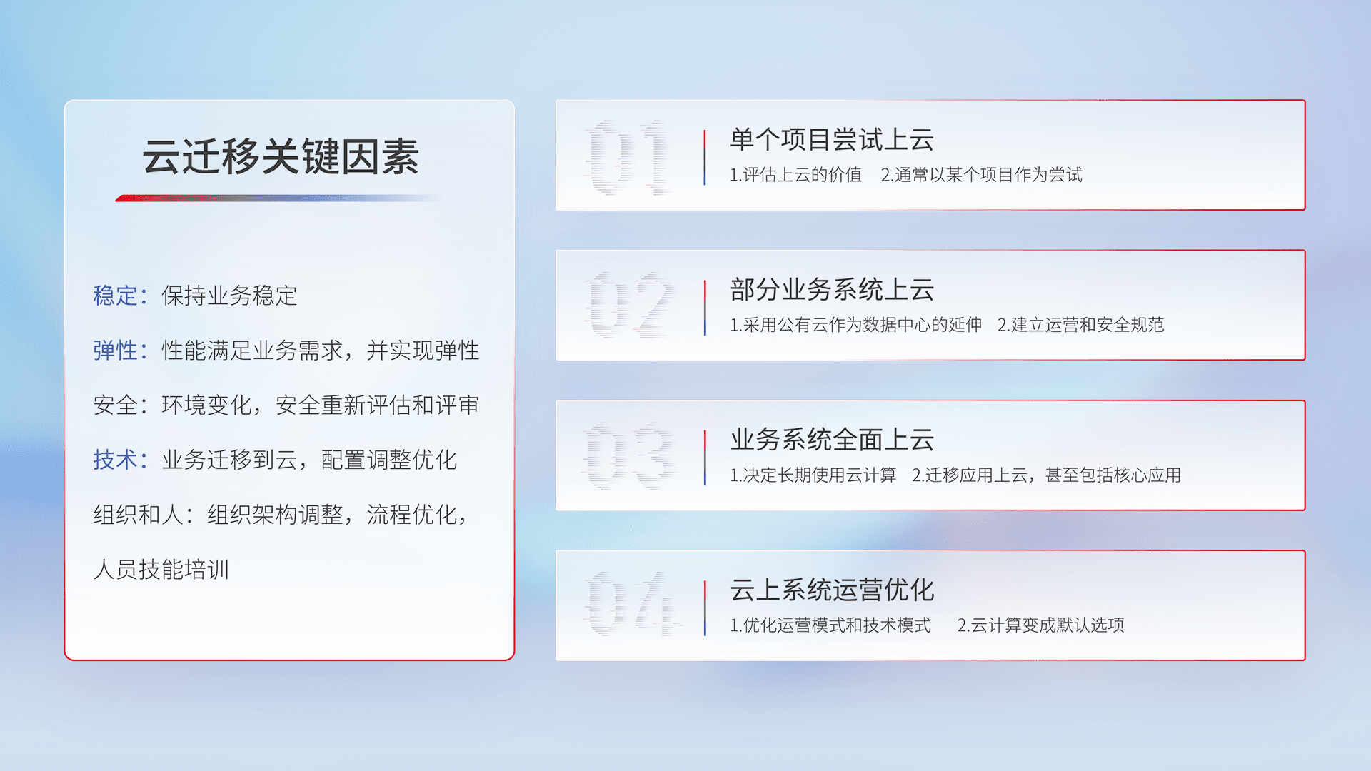结合实际业务,,,从规划设计、、云平台选型、、、云原生改造、、、、数据迁移、、、、集成交付,,,迁移全过程为客户识别最佳上云路径,,做好风险识别管理,,设计网络架构、、身份权限、、安全审计合规、、、操作审计、、、、日志审计、、、监控告警策略、、多站点容灾设计等,,对云上基础设施进行整体规划,,,,提升IT治理水平,,,以满足弹性、、、、高可用、、高性能的需求。。
